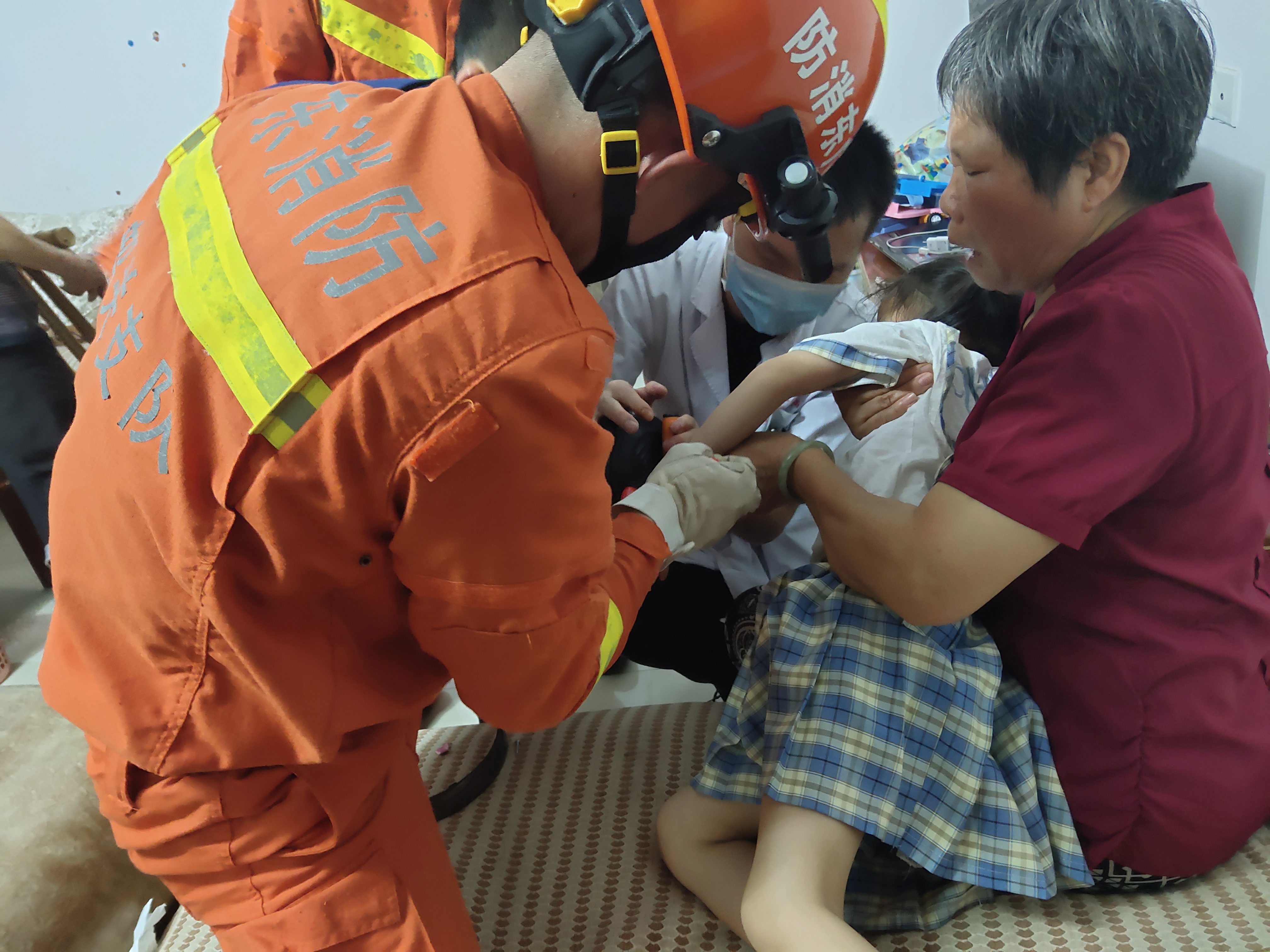 救援过程中,小女孩因疼痛一直在挣扎,哭闹不停,消防员只好与她的家人配合着安抚小女孩。通过询问其学校、家庭生活,不断转移其注意力,最终成功将小女孩的手指取出。