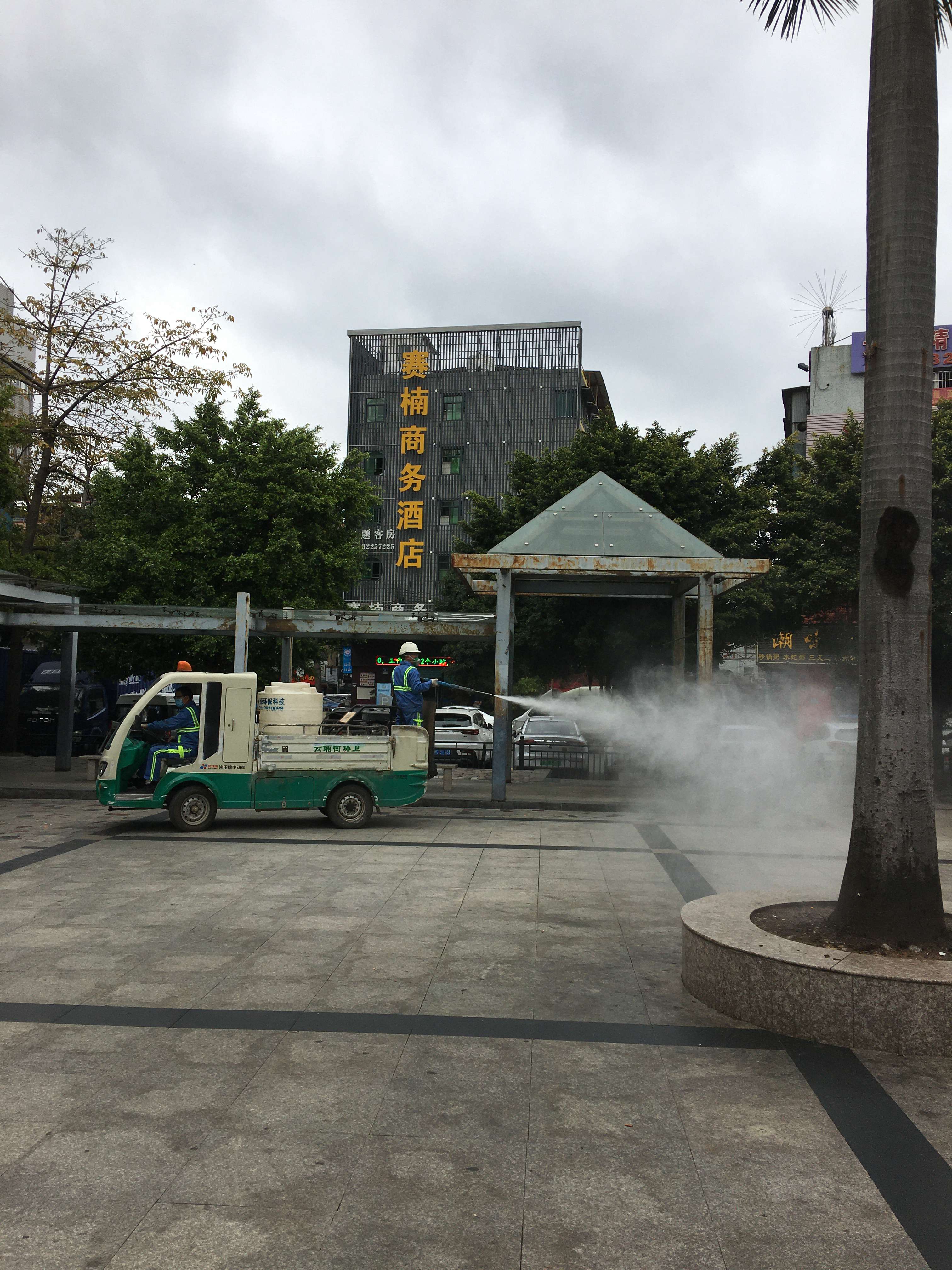 他们每天对各公共场所、社区进行日常消杀工作,加快生活垃圾清运频率,抑制病菌进一步扩散。图为云埔街环卫工人对公共区域进行全面消毒。
