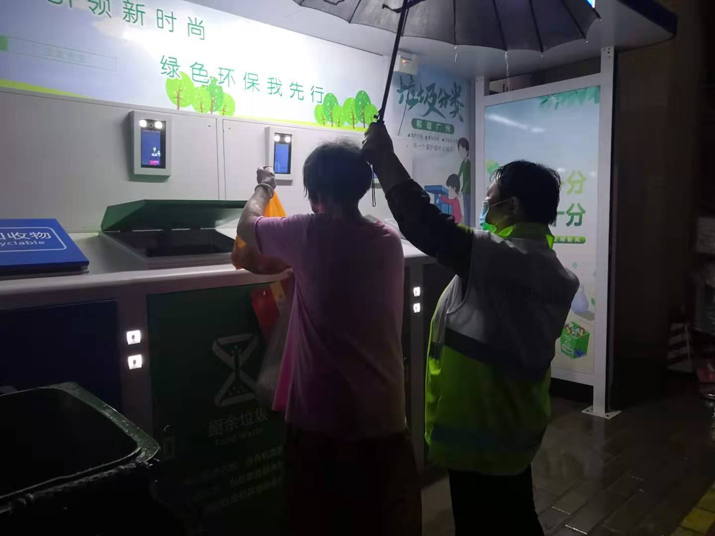 如今,垃圾分类督导员们不仅要指引居民垃圾分类,更肩负着提醒居民做好疫情防控的职责。图为大沙街垃圾分类督导员在夜间值守督导。