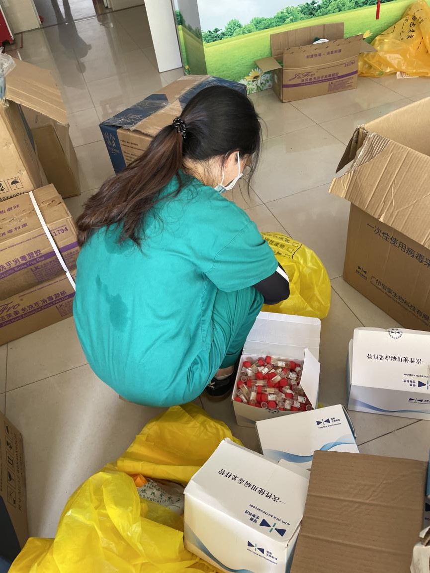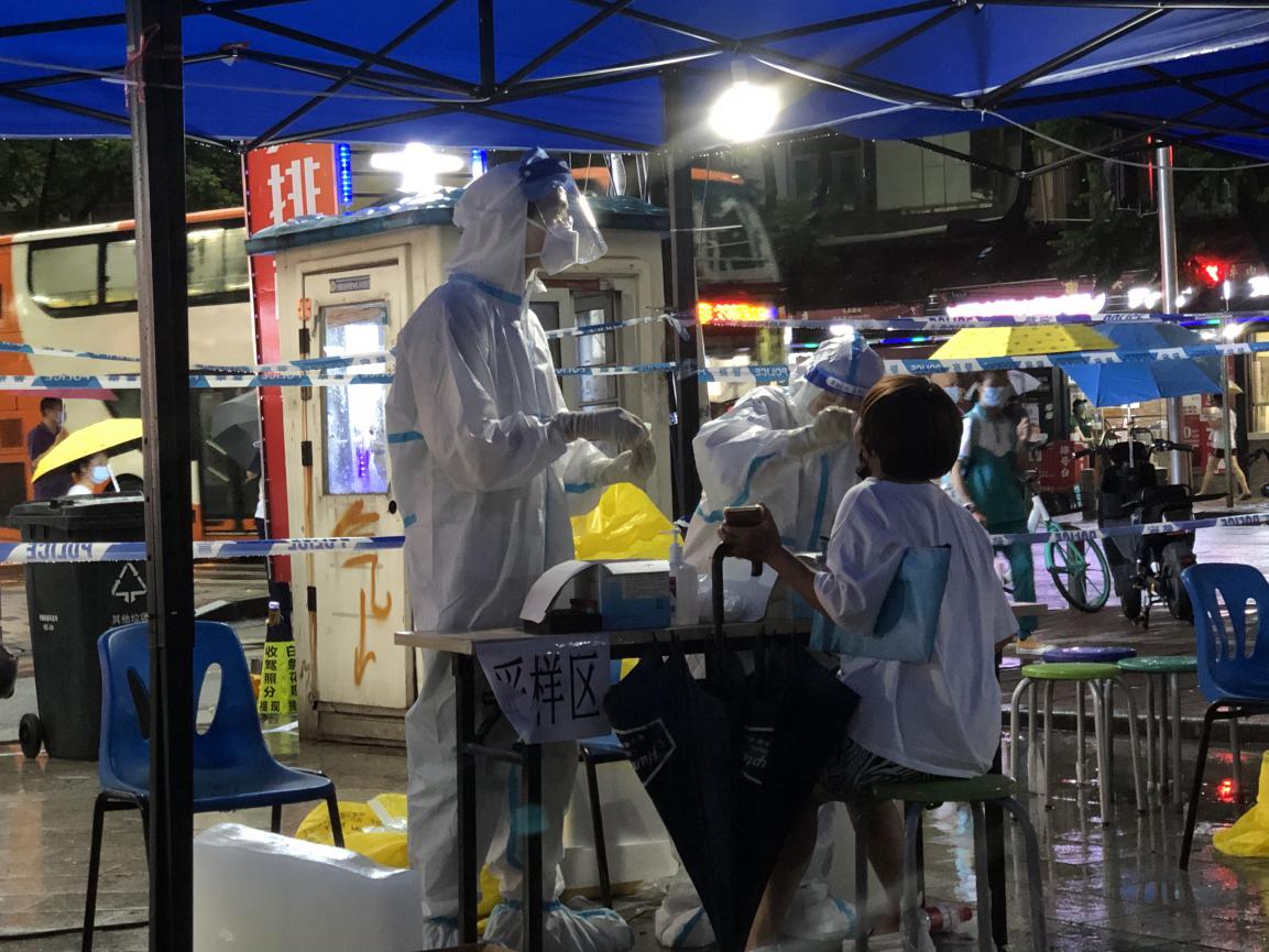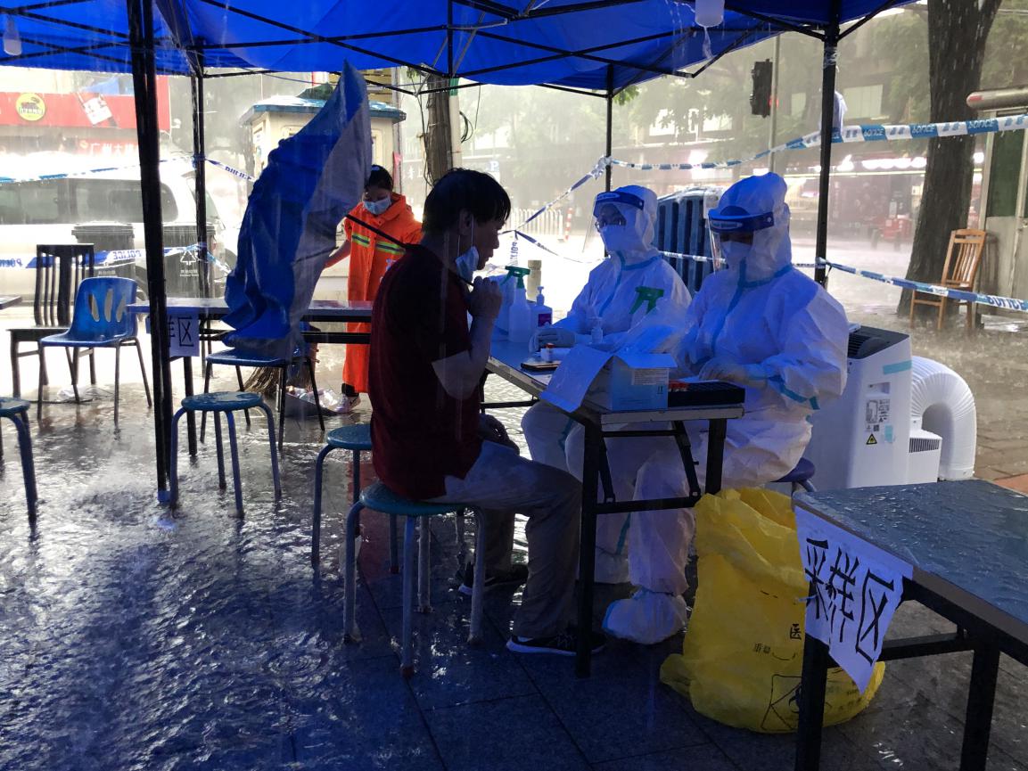 6月1日是广州市海珠区全员核酸检测第三天,下午开始暴雨袭来,持续了多个小时。由于降雨强度大,位于宝业路的海珠区沙园街华苑露天采样点瞬间出现了积水,沙园街社区卫生服务中心医生郑苹和黄杰丽坚守岗位,坐在暴雨中继续为市民进行核算检测采样。