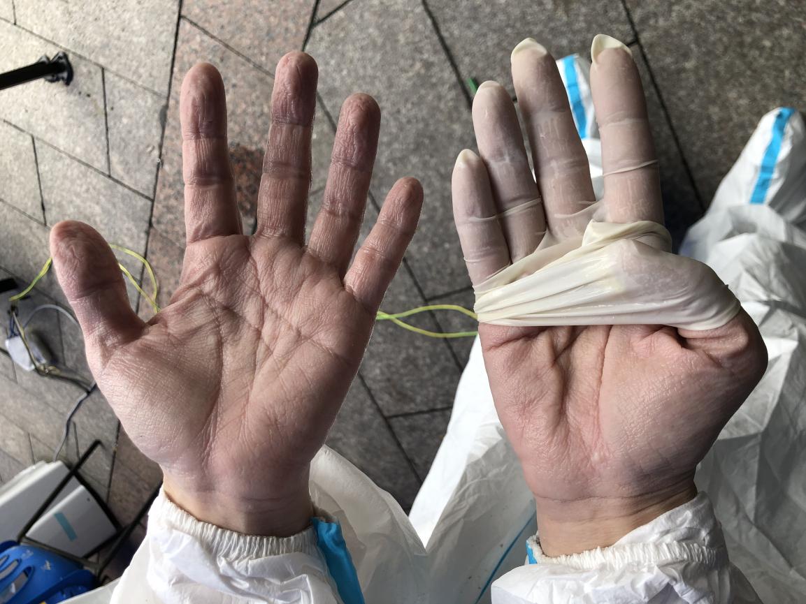 全科主治医师刘晓华脱下手套后皱巴巴泛白的双手