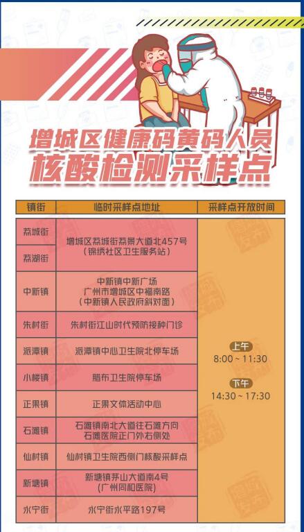 目前,增城区启用10个健康码“黄码”人员核酸检测采样点。请持健康码“黄码”的增城居民于每天上午8:00—11:30,下午14:30—17:30携带身份证到就近采样点进行核酸检测。