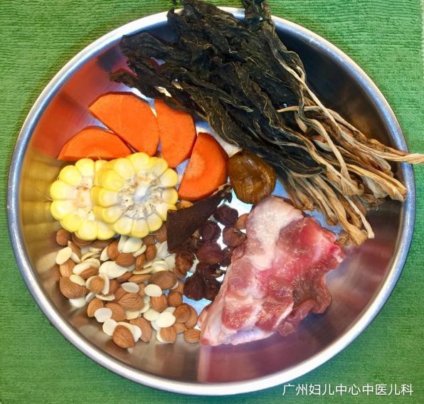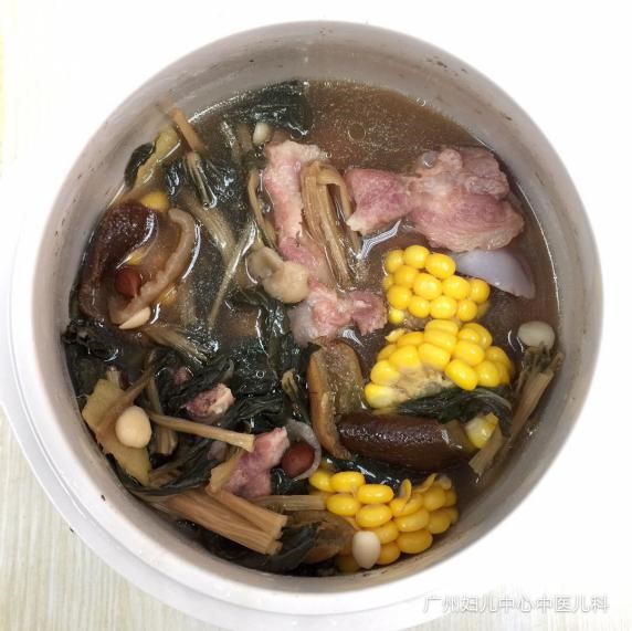 材料:菜干50克、南北杏20克、玉米半条、红萝卜50克、蜜枣1枚、陈皮5克、咸猪骨300克。