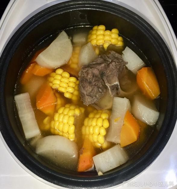 材料:红萝卜100克、玉米1条、白萝卜50克、蜜枣1枚、陈皮5克,牛骨300克、蒜头2瓣、生姜3片。