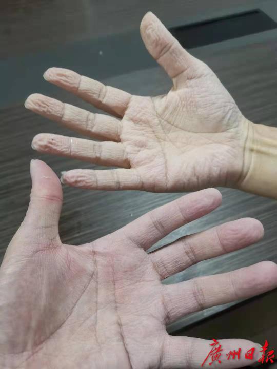 有突击队员脱下防护服时,手部早已被汗水浸湿