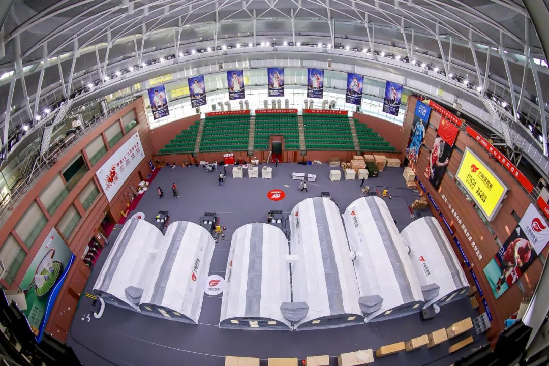 从6月4日20:41抗疫设备陆续进入场馆开始,现场基建师傅们就马不停蹄地开始作业,仅耗时4.5小时就快速搭建起了2套、6个舱体的快装式负压硬气膜核酸检测实验室(以下简称“硬气膜实验室”),并投入试运行。