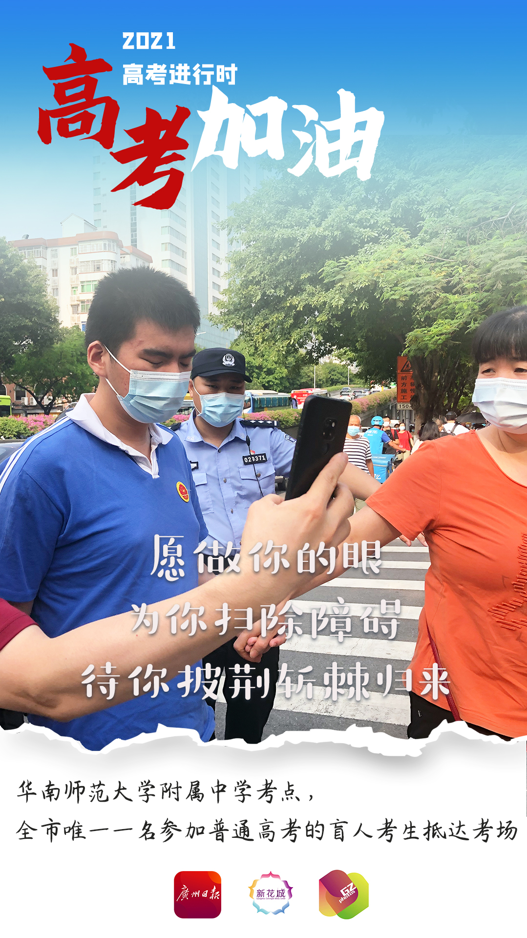今天上午,一位特别的考生来到华南师大附中考点参加高考,这位王同学是广州市第一位参加普通高考的盲人考生。为此,华南师大附中考点为这名考生做好了全方位保障工作。