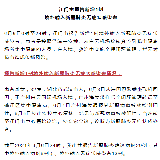 据江门发布消息,7日,江门市报告新增1例境外输入新冠肺炎无症状感染者。患者是按照省统一安排、从白云机场接转分流到江门隔离场所集中隔离的人员,在入境、救治中实施全程闭环管理,暂无对江门市造成传播风险。