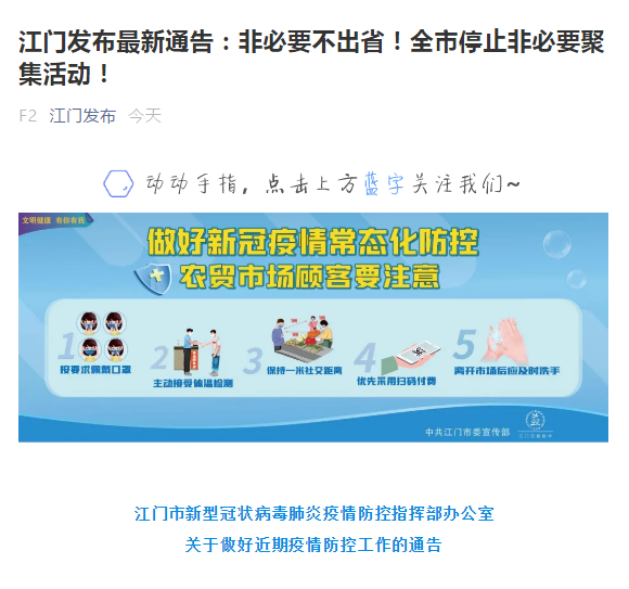 江门市新型冠状病毒肺炎疫情防控指挥部办公室发布关于做好近期疫情防控工作的通告: