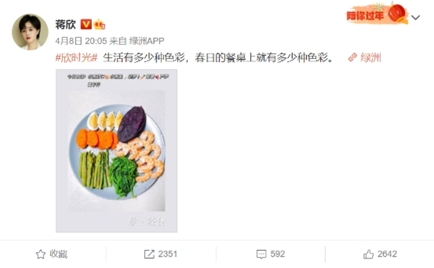 蒋欣的食谱一直遵循着低油、低糖、低盐的标准,食物的种类丰富,但采用最简单的烹饪方式,最大限度保留食物的营养,同时不为身体增加额外的负担。在控制摄入的同时,通过运动提高身体代谢,也在一定程度上加速了脂肪的消耗。
