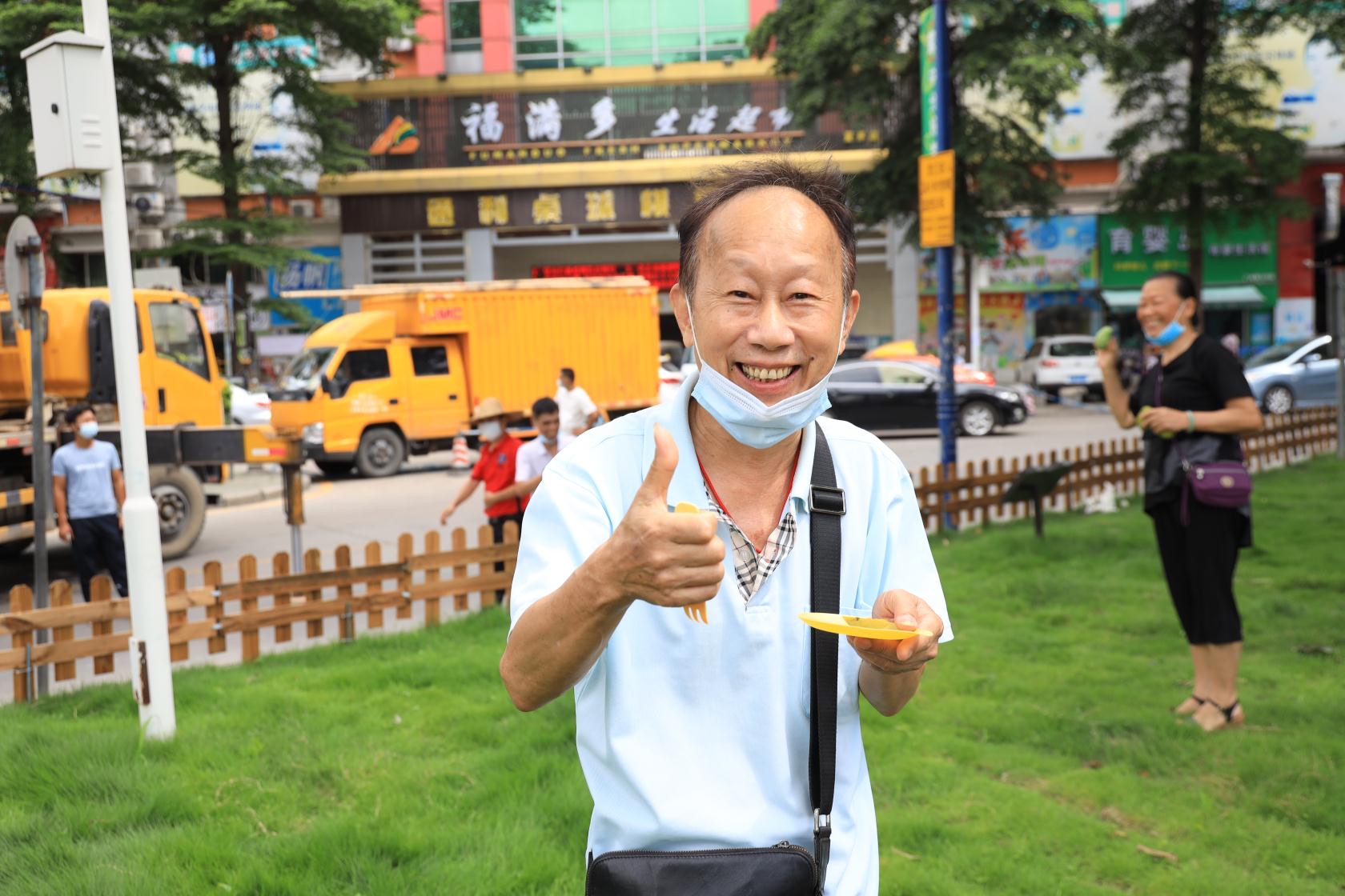 村民品尝新鲜香芒,竖起大拇指