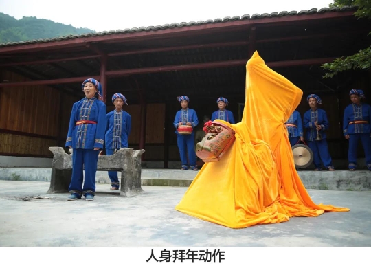 瑶族布袋木狮舞又称“舞龙犬狮”,属瑶族过山瑶传统舞蹈,多在农历十月丰收季节和翌年春耕前,在地塘、祖厅、晒谷场等地表演。表演前,先举行祭祀祖先,行请木狮的礼仪。表演时,木狮内 1 人舞狮头,其他人舞狮被。木狮舞动时,木狮头随乐曲节拍张合甩动,发出“啯啯”的响声,并带动其他舞者在木狮内撑起狮被,变换不同的动作。随锣鼓乐伴奏下,协同配合构成各种造型,每个造型为之一景,共72 景。每一景按情感表达不同可分为喜、悲、护、想、报、形、反七类,借助狮子的不同造型,寓意瑶族先祖漂洋过海迁徙的艰辛过程,以及对美好生活的憧憬。舞狮时由唢呐、大、小镲、笛子等乐器伴奏,舞毕由一对男女唱着迁狮调,引导木狮离开。迁狮调以唱为主,中间穿插对白,内容多为表现瑶族对客人的欢迎,对瑶家成婚、添丁等的庆贺。