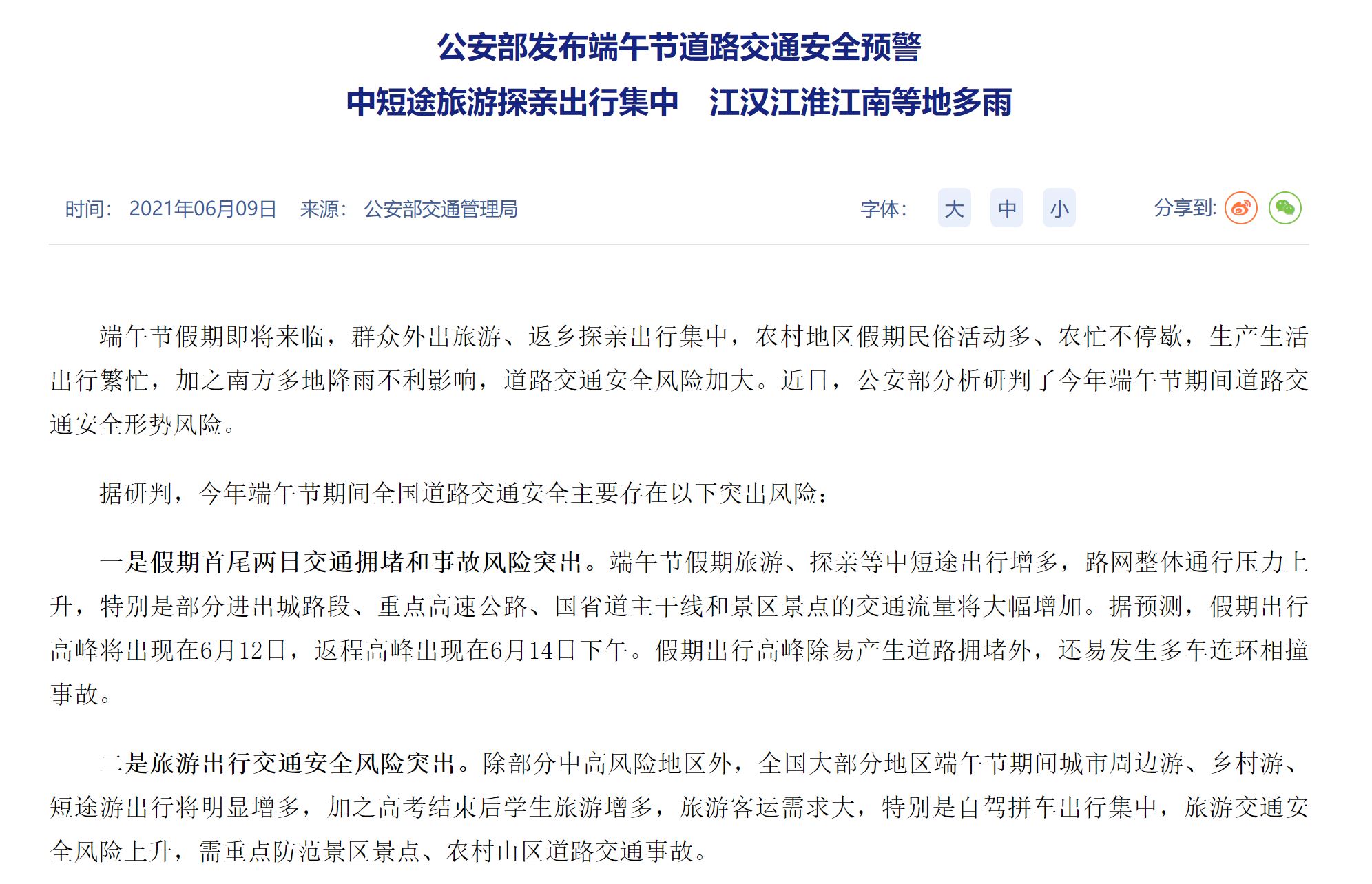 6月9日,公安部发布端午交通安全预警。据预测,假期出行高峰将出现在6月12日,返程高峰出现在6月14日下午;假期出行高峰除易产生道路拥堵外,还易发生多车连环相撞事故,假期首尾两日交通拥堵和事故风险突出。