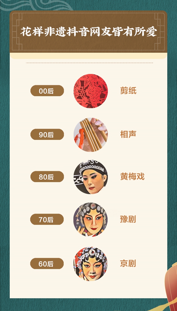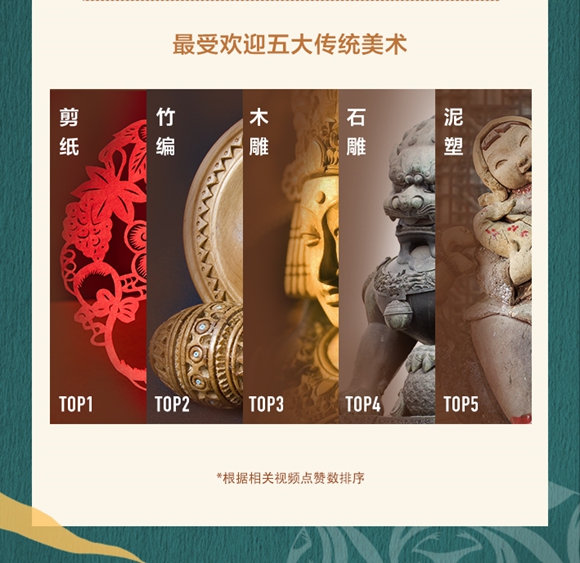 根据非物质文化遗产的分类,京剧、黄梅戏、豫剧、越剧、秦腔因获赞数排名前列,入选抖音最受欢迎五大传统戏剧;唢呐艺术、陕北民歌、古琴艺术、儋州调声、南音入选抖音最受欢迎五大传统音乐;剪纸、竹编、木雕、石雕、泥塑则入选最受欢迎五大传统美术,其中剪纸在抖音获赞超过1.3亿次。