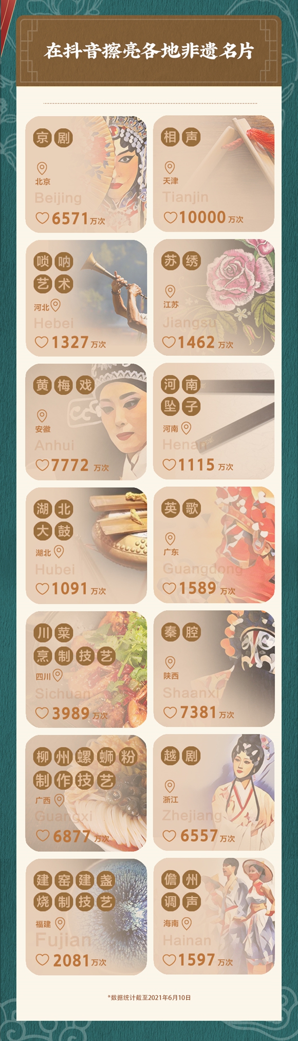 6月12日第16个文化和自然遗产日前夕,抖音发布非遗数据报告(以下简称报告)。报告显示,截至2021年6月10日,抖音上国家级非遗项目相关视频数量超过1.4亿;1557个国家级非遗项目,抖音涵盖率达97.94%。