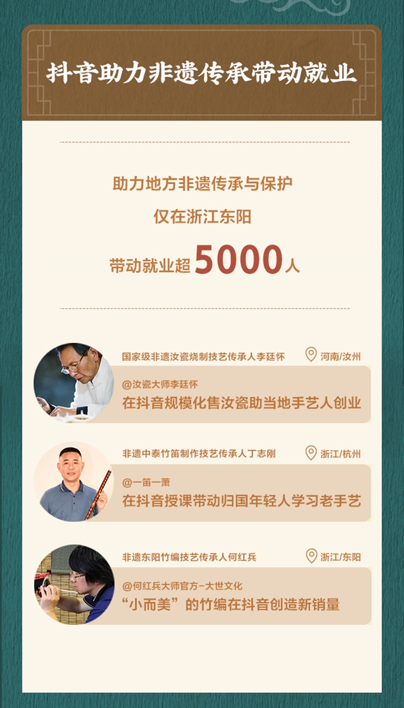 在浙江东阳,抖音电商带动非遗相关就业超过5000人。过去一年,国家级非遗代表性项目汝瓷烧制技艺传承人李廷怀,通过抖音电商销售汝瓷超过300万元,带动了当地手艺人创业。
