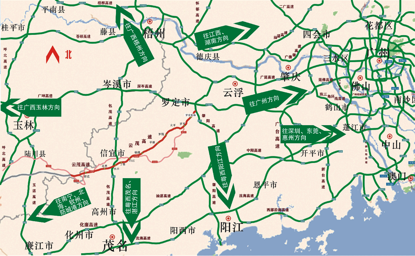 云茂高速是沟通粤港澳大湾区和广西北部湾经济区的一条经济干线,建成通车后,正式结束信宜市东部山区无高速经过的历史,信宜至罗定的路程将缩减至1个小时,从粤西山区到粤港澳大湾区、广西玉林均可节省1小时,农产品运输成本将有效降低,进一步优化粤西山区发展环境。