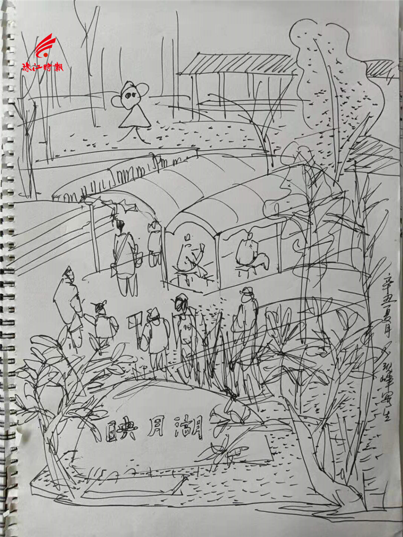 “我的工作室就在映月湖附近,平时经常去散步,这里的每一处景象我都很熟悉,平时也画了不少与映月湖有关的画作。” 郑现峰说,在这次疫情防控中,映月湖公园成为桂城核酸检测点之一,全民齐心抗疫的场景平时在映月湖是看不到的,更应该记录下来。