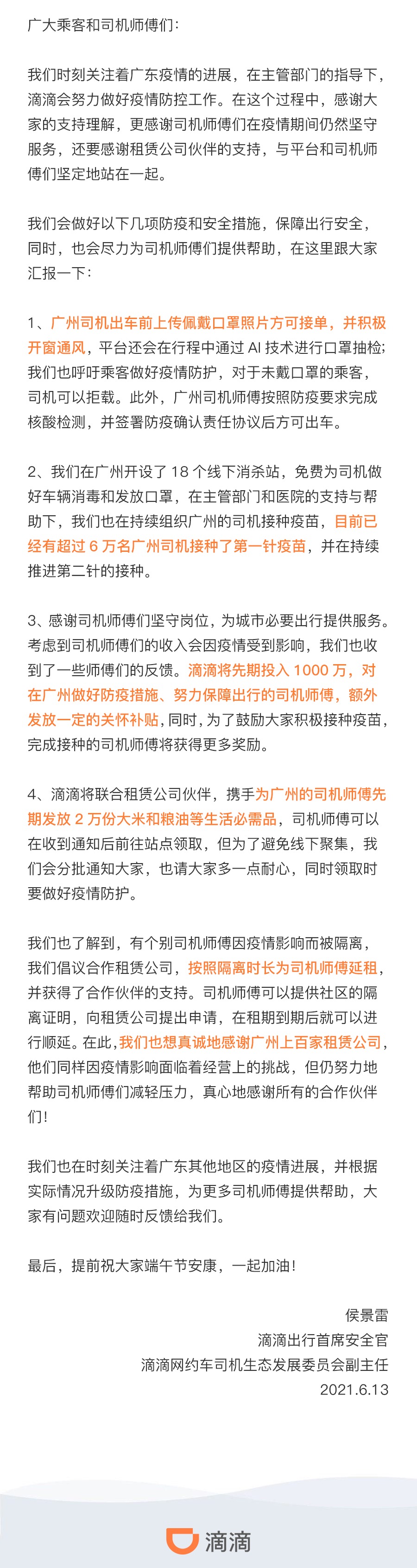 6月13日,滴滴首席出行安全官侯景雷在其微博上公布滴滴出行在广州的防疫措施。他表示,广州司机出车前上传佩戴口罩照方可接单,平台还会在行程中通过AI技术进行口罩抽检,并呼吁乘客做好疫情防护,对于未戴口罩的乘客,司机可以拒载。目前已经有超过6万名广州司机接种了第一针疫苗,并在持续推进第二针的接种。