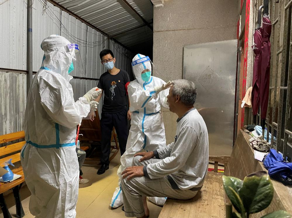 图为:杨志华协助医护人员上门为社区独居老人等检测核酸。