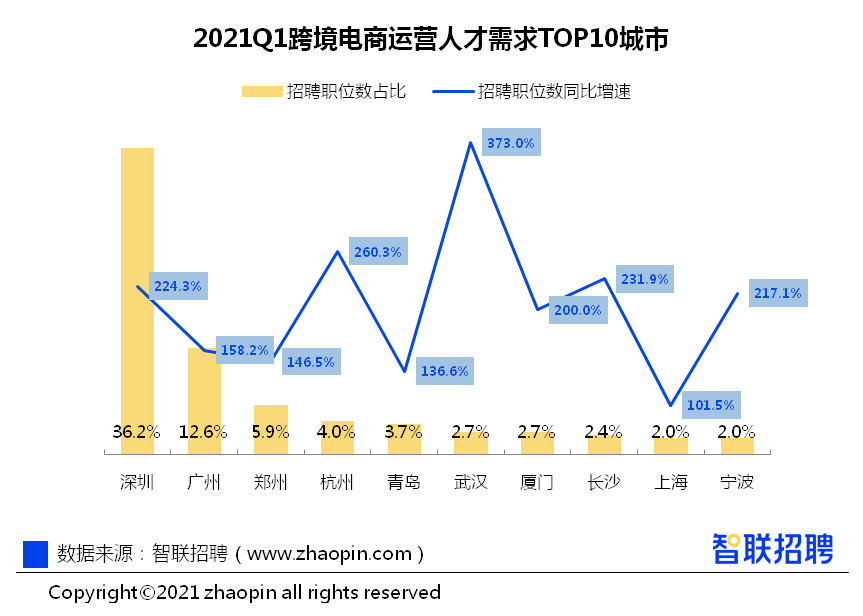我国外贸进出口保持强劲增长,实现2021年"开门红",第一季度贸易进出口总额同比增长29.2%。在 进出口贸易"风景独好"与新业态完善的趋势下,相关人才需求大幅上涨。记者从日前智联招聘发布的《2021外贸行业人才形势研究报告》获悉,2021年第一季度,跨境电商运营招聘需求规模同比猛增190.9%,其中深圳人才需求量占全国36.2%,位居全国首位。
