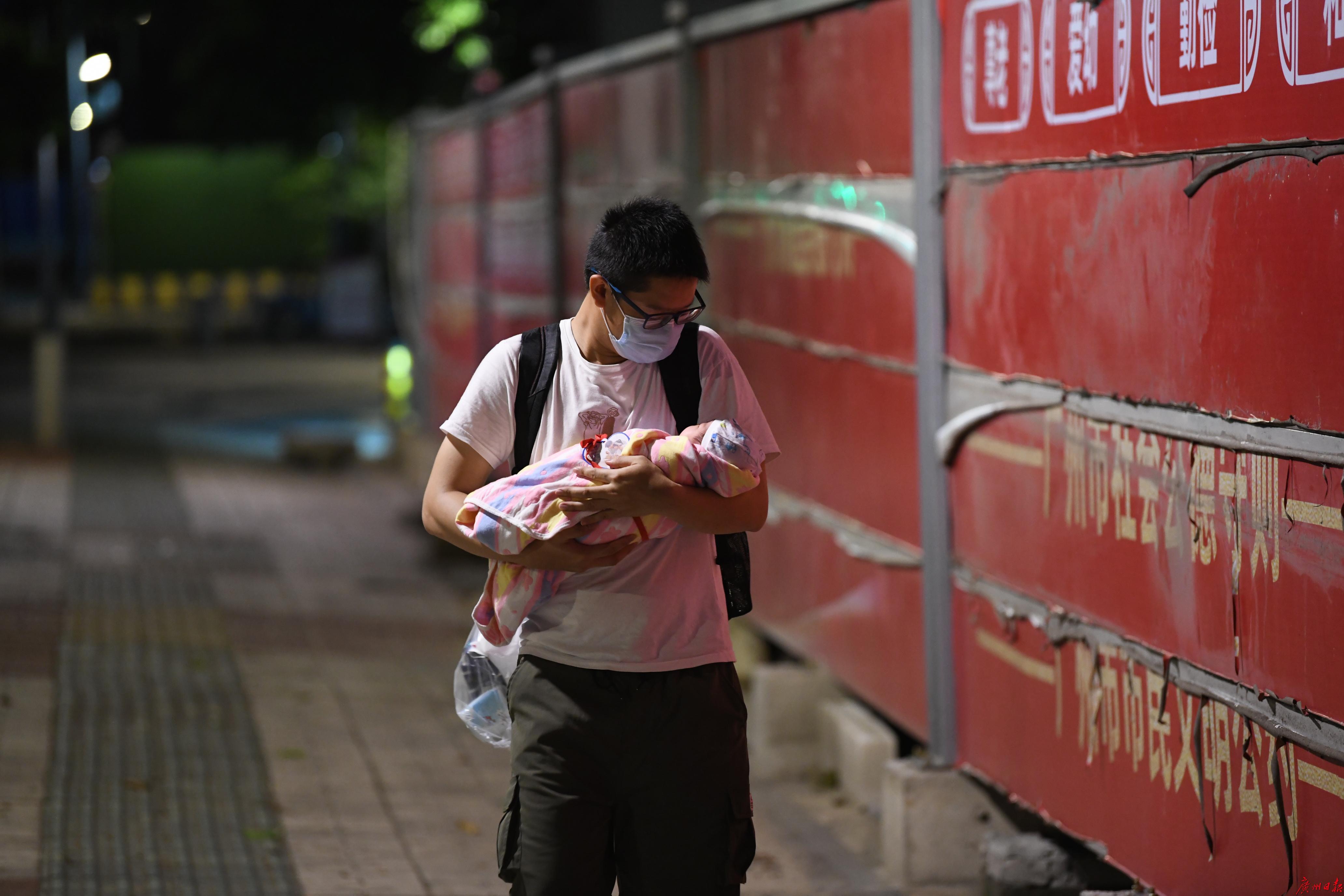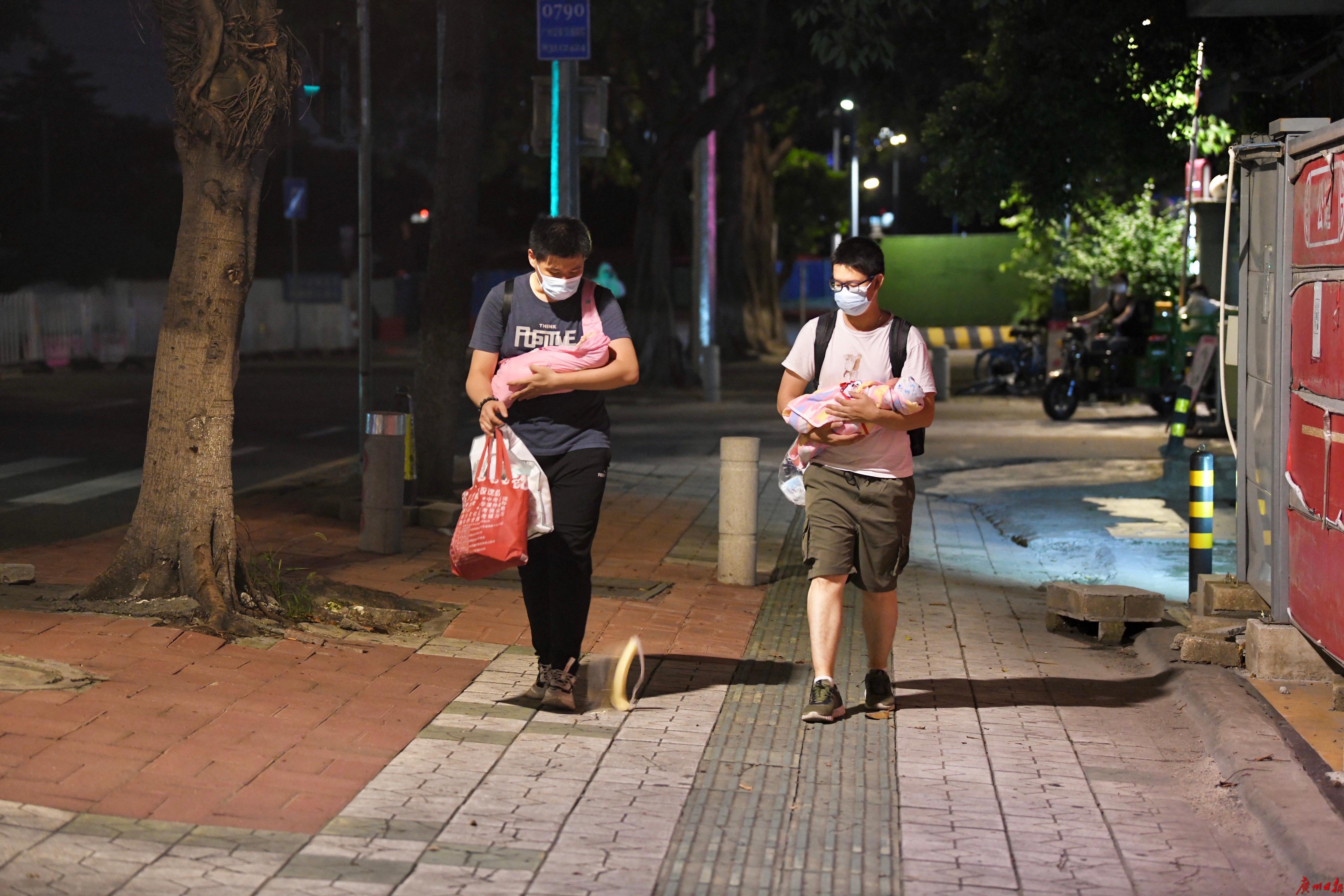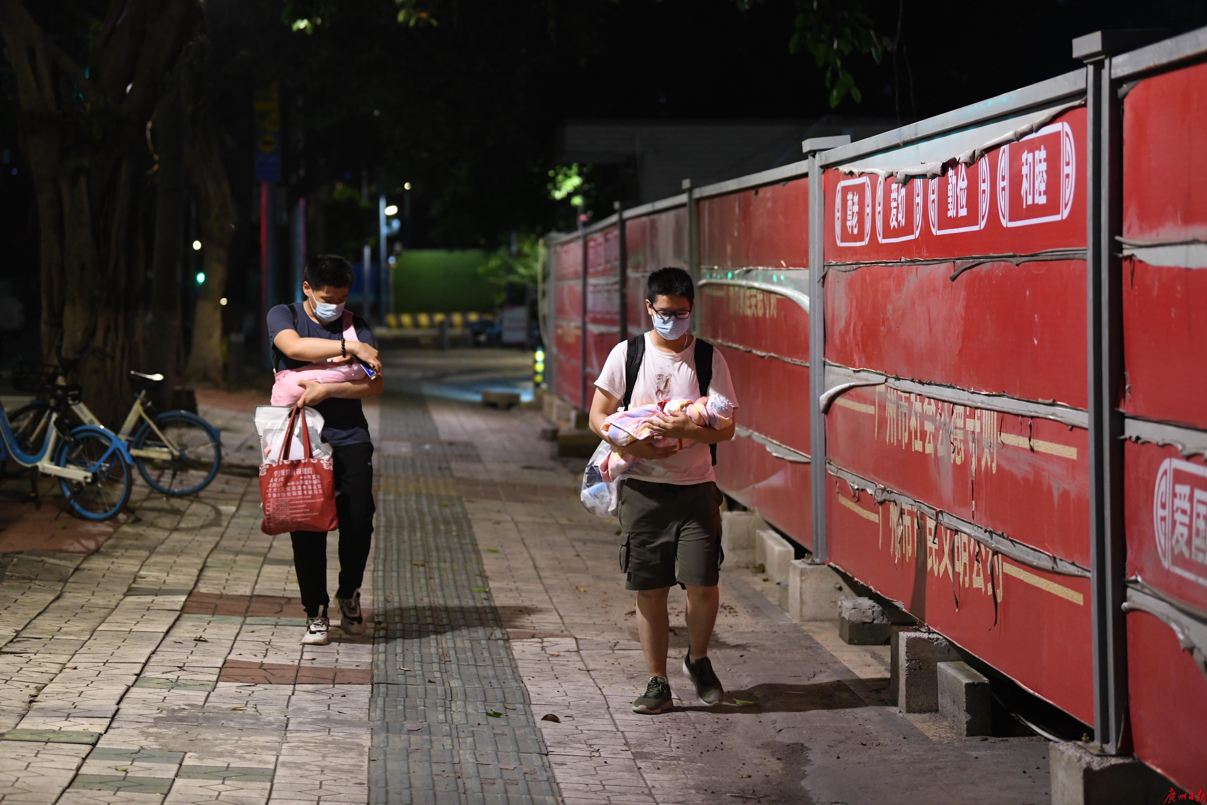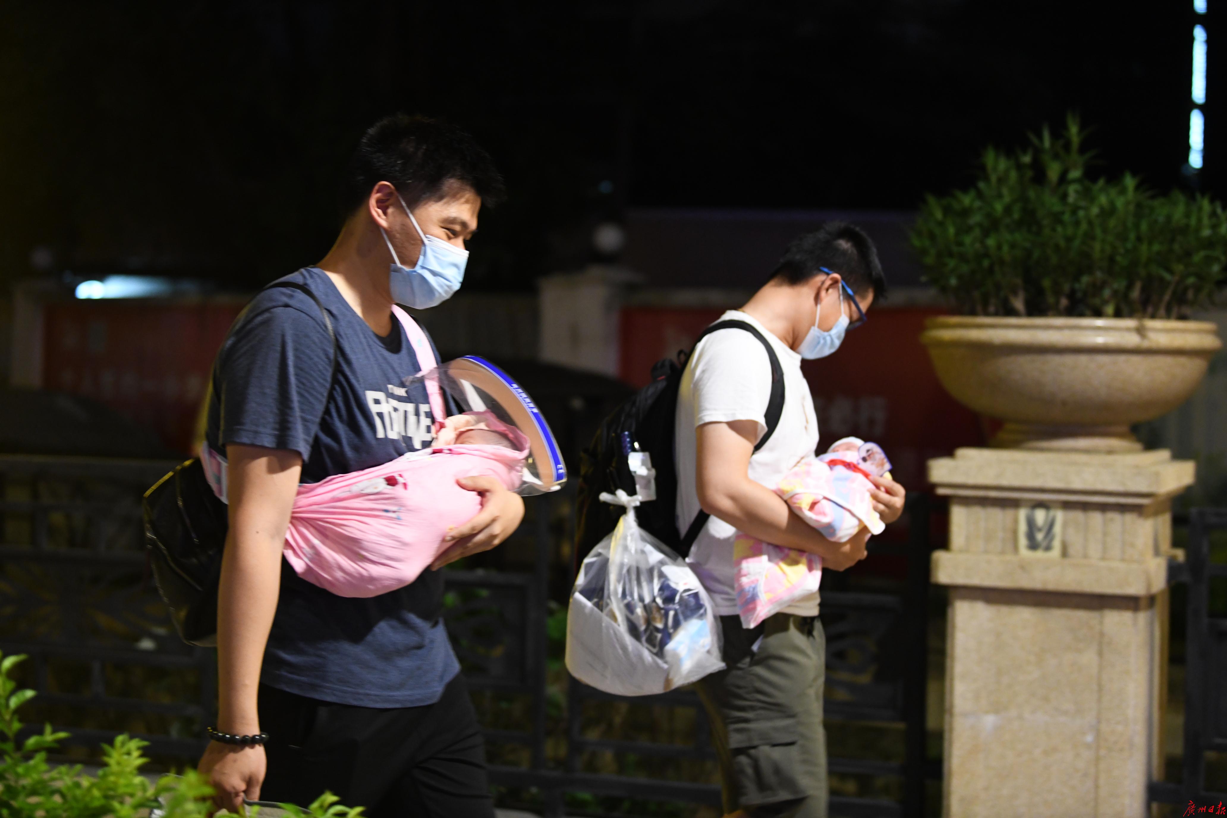 6月15日晚上8时出头,记者在荔湾区妇幼保健院采访后正准备离开,看到两个新生儿爸爸正小心翼翼地搂着出生仅几天的孩子出院,场面十分温馨。他们要从医院步行到卡口与孩子妈妈汇合,再乘车离开前往月子中心。