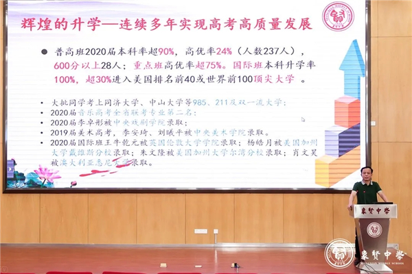 此外,作为象贤一大亮点的国际部,当天也进行了线上招生宣讲。刘应家老师从国际部简介、升学成果、2021年招生计划及政策解读等方面给家长们带来众多信息。