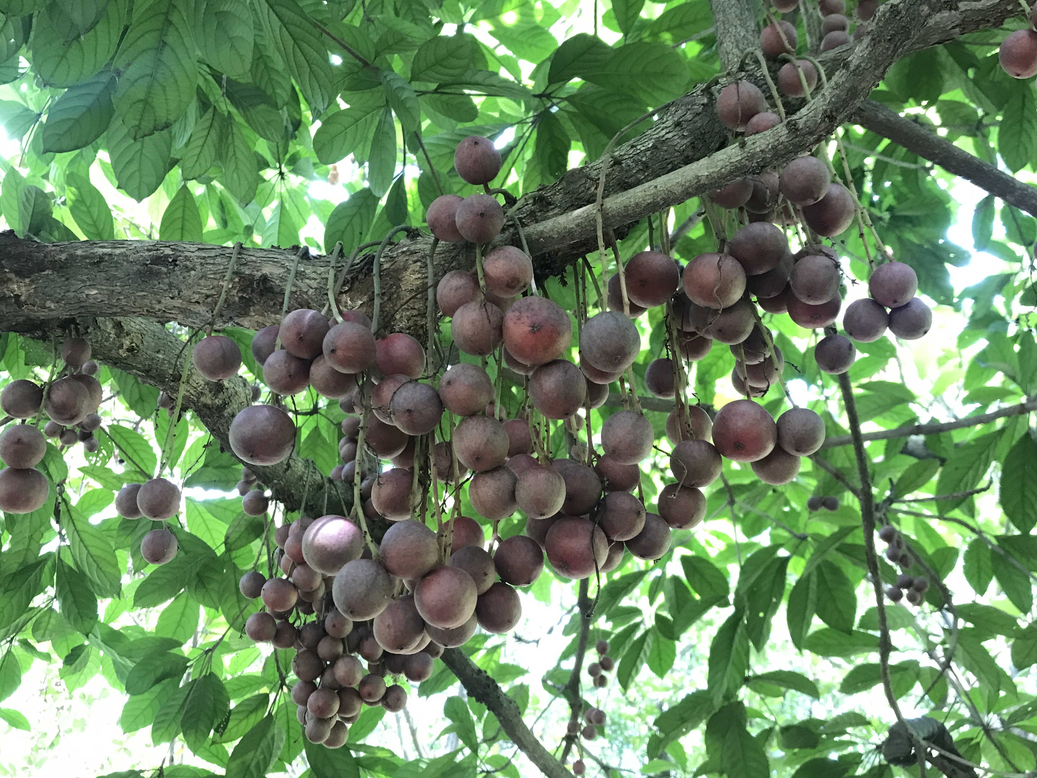 每年6、7月间,一串串指头般大小的扁圆形果实就挂满了大树,从树干基部连到树顶,甚至坠弯枝条,由生至熟,或绿或黄或红;似绿玉雕成的小球、似乳黄的玛瑙珠子、或似鲜红的珊瑚念珠,煞是招人喜爱。其果肉多汁,酸甜可口,生津止渴,消暑解热。尽管木奶果味道酸甜,产量也高,可惜并没有作为水果广泛种植,一般市面很难见到。