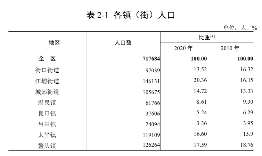 2020年,全区常住人口在10万人以上的镇(街)有4个,比2010年增加了3个。人口进一步向中心城区和发展区集聚。