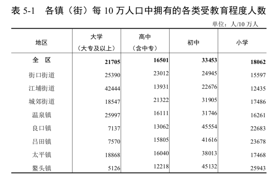 从每10万人中拥有大学文化程度的人口数看,与2010年相比,从化区由12589人增至21705人,比全省平均水平多6006人,虽与全市平均水平仍差5527人,但增长率比(72.41%)比全市高30.55个百分点,与2010年比差距已逐步缩小。