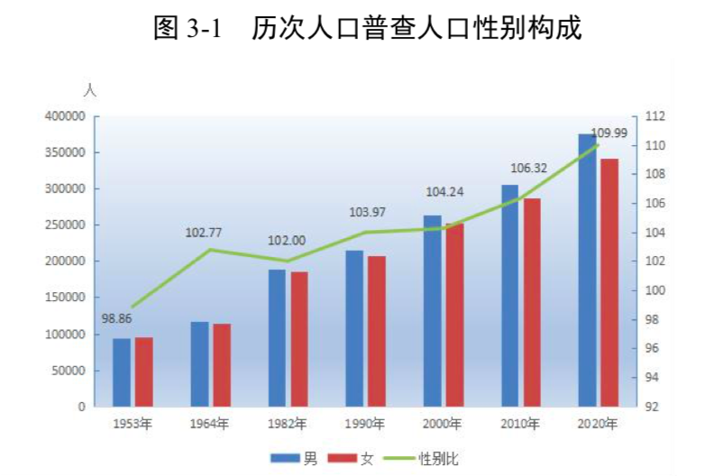 全区常住人口中,男性人口为37.59万人,占52.38%;女性人口为34.18万人,占47.62%。总人口性别比(以女性人口为100)由2010年第六次全国人口普查的106.32上升为2020年的109.99,比全市及全省分别低1.99、3.09个百分点。