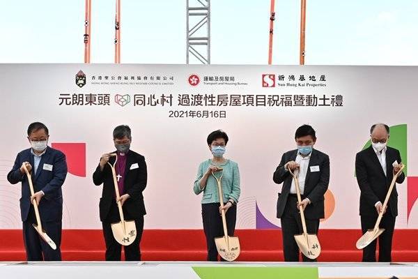 6月16日,林鄭月娥在出席香港「同心村」過渡性房屋項目動土儀式時表示,香港特區政府目前已覓得足以提供約1.5萬個過渡性房屋單位的土地和樓宇,未來會繼續努力,全速落成過渡性房屋單位,儘快為居住環境惡劣的家庭帶來曙光。