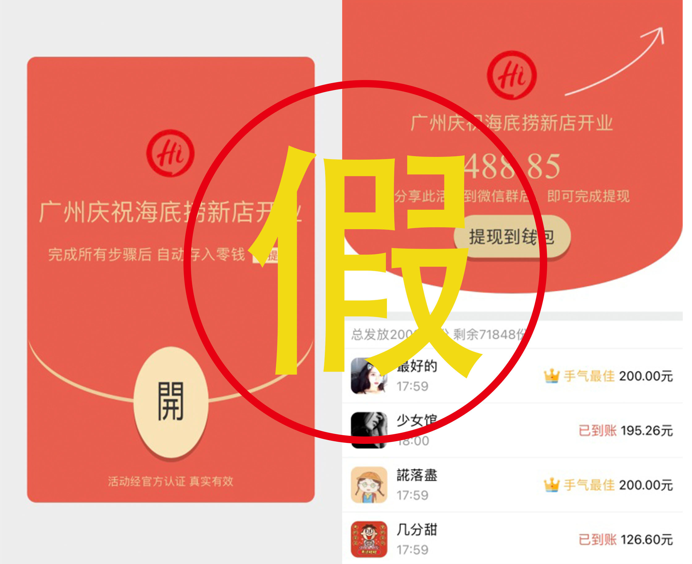 海底捞相关负责人介绍,已经多次发现类似的网上不法行为,并在线上通过举报、与平台方联系等方式打击此类信息,还特别在官网发布声明,提醒消费者不要受骗;在线下则向监管部门进行举报并提醒消费者。海底捞强调,公司的相关活动均通过官网、官方微信公众号、微博等官方渠道发出,假冒红包的跳转链接均不能相信。