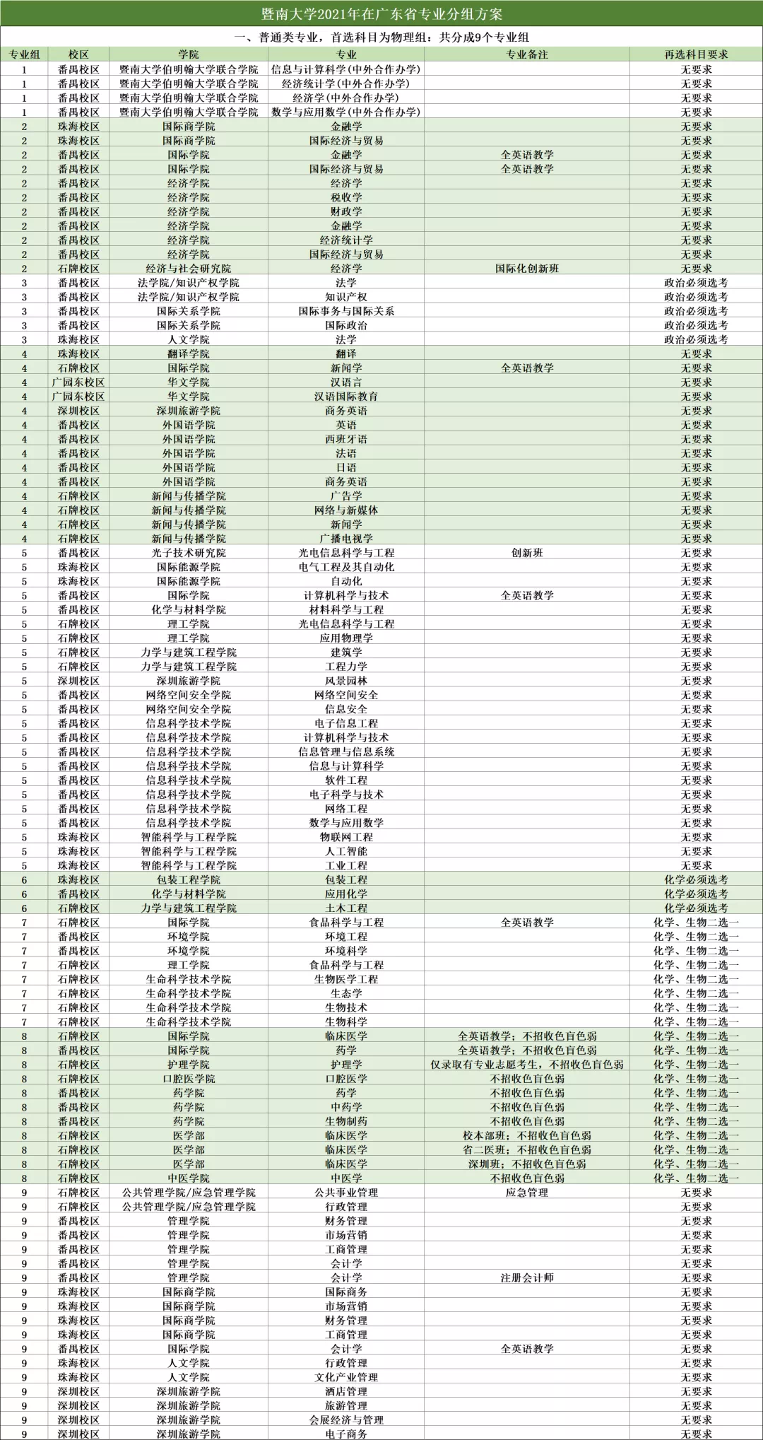 近日暨南大学正式发布2021年广东省专业分组方案及2021年分省招生计划。根据计划,暨南大学预计2021年面向31个省、自治区、直辖市招生计划4860人。广东招生方面,按照“学科门类”为分组基本原则将2021年在广东省招生的本科专业分组方案确定为15个专业组,分物理类、历史类两个大类。