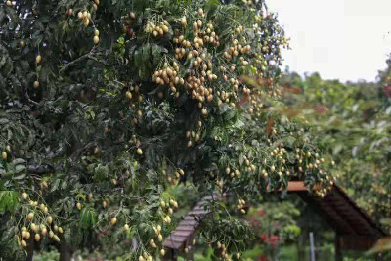 游龙岗,尝黄皮。走在龙岗村村道上,一路果树飘香,一排排黄皮树上挂满金灿灿的果实,一串串果实压弯枝头。