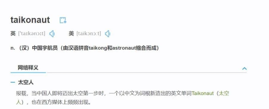据了解,词根taiko出自“太空”的拼音,目前该词也被牛津词典收录,意思为Chinese astronaut(中国宇航员)。