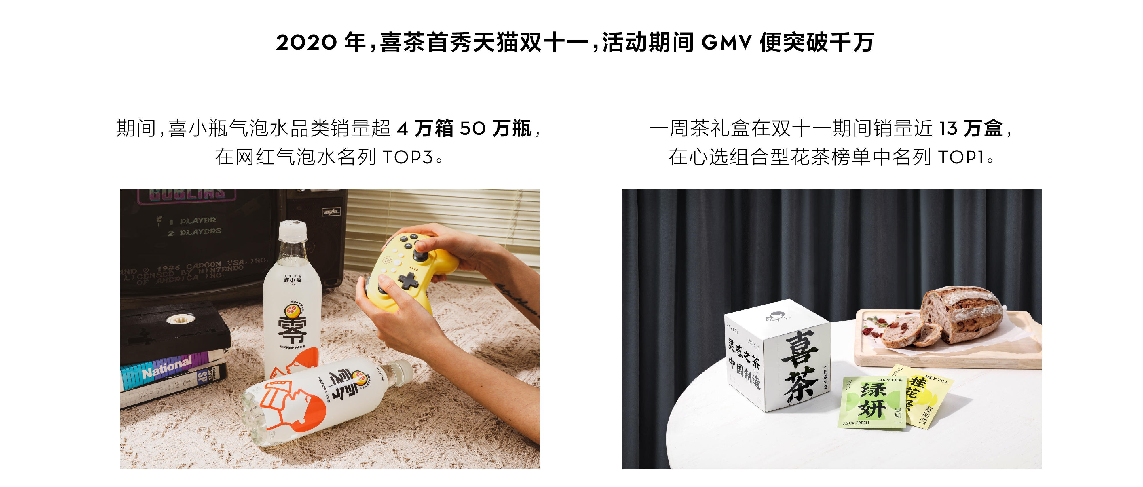 2020年7月,喜茶正式进军瓶装饮料业务,短短一年时间内,这一业务线得到快速发展,品牌势能逐步拉升,并在多个电商大促节点取得不俗销售表现。2020年双十一期间,喜茶气泡水销量超4万箱、50万瓶;2021年春节期间,新品海盐柚子气泡水带动全线喜茶气泡水商品在年货节期间售出近6.5万箱、约75万瓶。