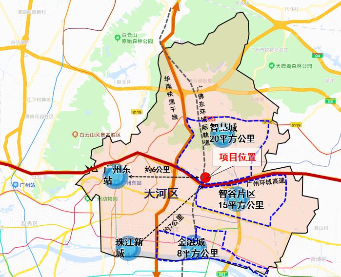 项目位置图地块位于广州市天河区智慧城核心区,华南快速干线以东、广州环城高速以北。项目地块距离广州东站约6公里、距离珠江新城约7公里。本次控规修改范围面积46.1公顷,西侧为岑村机场及大观净水厂,北侧为岑村物业,东侧为菠萝山保障房及旧厂,地块内部原为岑村农田,目前已收储,现状为空地。