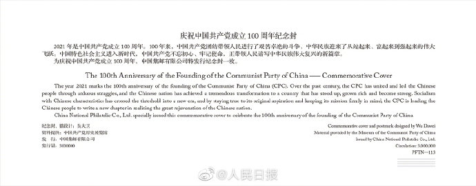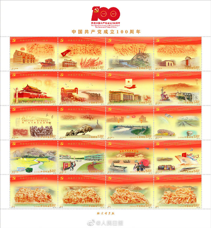 中国邮政将于2021年7月1日发行《中国共产党成立100周年》纪念邮票1套20枚,纪念封1套1枚。纪念邮票内容为:开天辟地、峥嵘岁月、中流砥柱、伟大胜利、开国大典、抗美援朝、制度奠基、自力更生、改革春潮等。