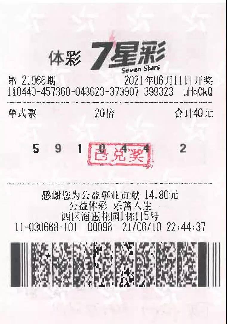 6月11日,体彩七星彩第21066期开奖,惠州购彩者唐先生(化名)以40元收获20注七星彩的500万元头奖,共揽获1亿元巨奖,为当地贡献个人所得税2000万元,打破惠州体彩大奖纪录,更作为“体彩七星彩全国首个亿元大奖”而载入了史册。