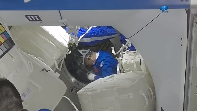 18日早上5点40分,航天员汤洪波已经起床,在睡眠区里洗脸、刷牙等。此时,空间站内的灯光还没有全部打开,在每名航天员的睡眠区,设有独立的灯光系统。几分钟后,航天员汤洪波完成洗漱,离开睡眠区,飞向工作区,开始了一天的工作。