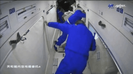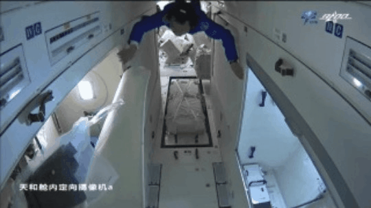 13点30分左右,航天员汤洪波飞向自己的睡眠区,虽然是第一次飞行,太空生活才一天多的时间,汤洪波已经可以在微重力环境下,很好地控制自己的姿态。不一会儿,航天员聂海胜也来到了睡眠区,开始午休。经过近一个小时的休息,14点多,航天员们结束了午休,又投入到工作中。