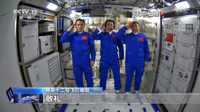 6月17日晚,航天员进入核心舱后报告敬礼现场。