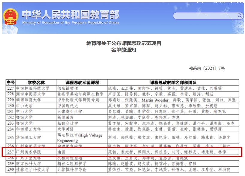 近日,教育部正式公布了首批国家级课程思政示范项目入选名单(教高函〔2021〕7号),广州美术学院课程《油画》入选2021年高校课程思政示范课程,课程负责人广州美术学院范勃教授及教学团队入选高校课程思政教学名师和团队。此次共评选出300个普通本科教育类课程思政示范项目,其中广东省高校共入选10个(含部属高校6项)。广州美术学院《油画》课程经过层层筛选和激烈竞争,脱颖而出,既是全国美术院校为数不多的入选项目之一,也是该校艺术思政建设的标志性成果。