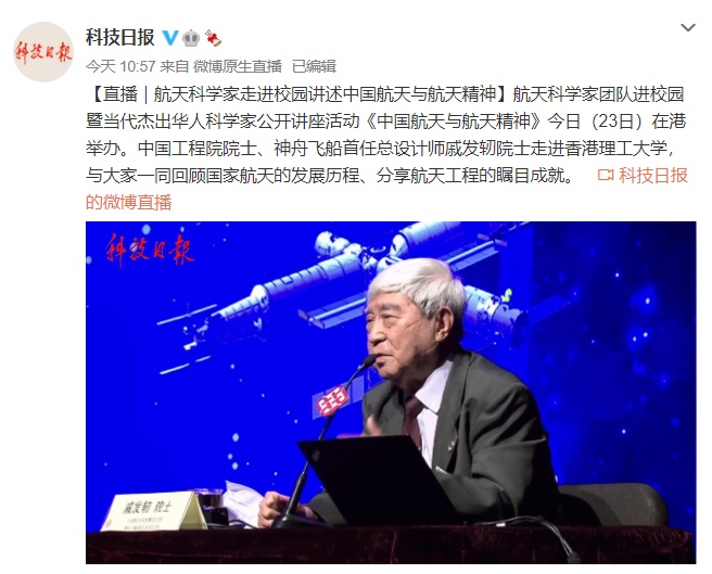6月23日上午,一場神舟飛船首任總設計師戚發軔院士的《中國航天與航天精神》報告會在香港理工大學舉行。報告會互動環節中,今年88歲的戚發軔院士向香港青年發出了真誠的邀請:希望更多香港青年加入中國航天事業。