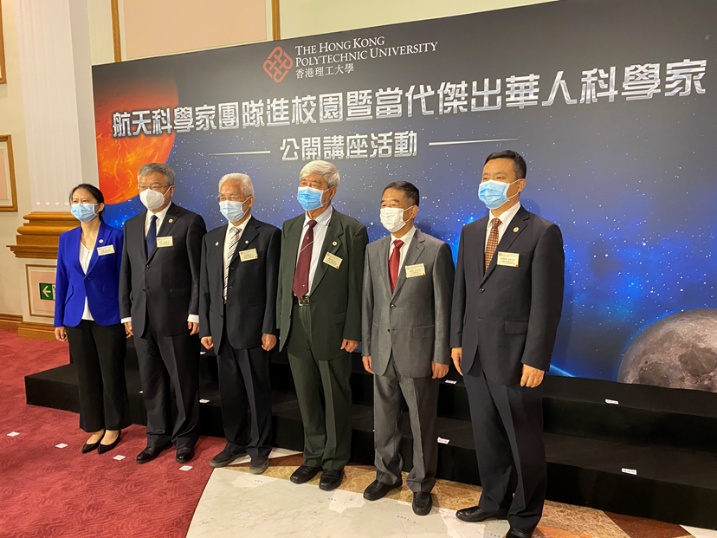 活動開始前,6位航天科學家在香港理工大學合影。左起為:張熇、謝軍、龍樂豪、戚發軔、胡浩、孫澤洲