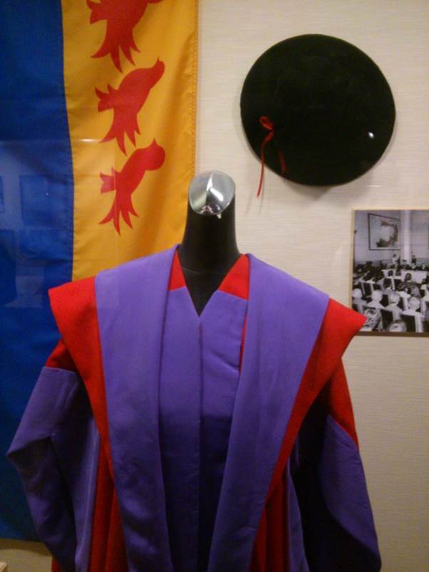 在宋庆龄故居的宋庆龄生平展厅中,有一套博士服和博士帽,蓝底红边黑帽。它们与国内的博士服装不太一样,这是加拿大维多利亚大学授予二十世纪伟大女性宋庆龄的。宋庆龄在临终之前20天穿戴过了这套博士服和博士帽。