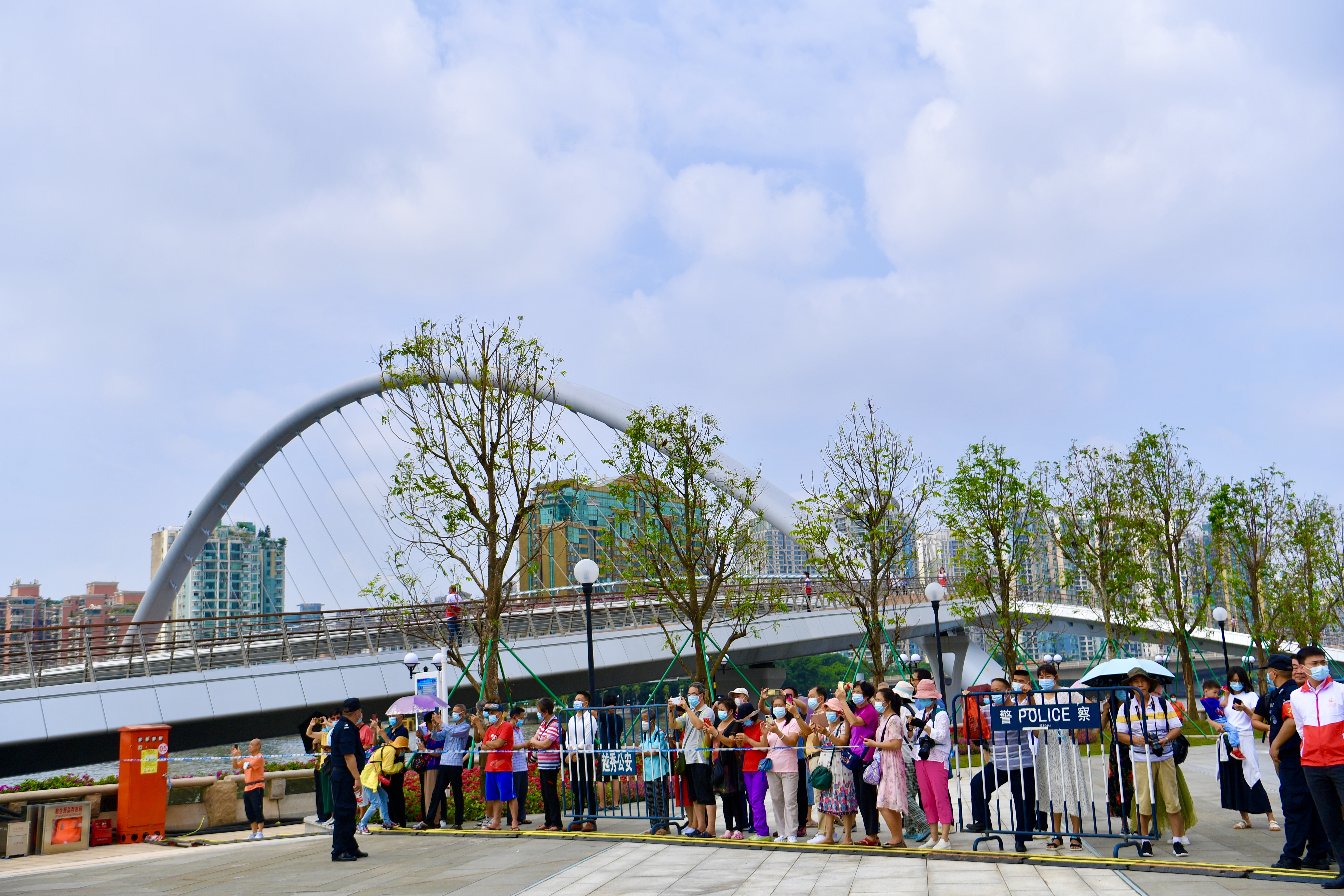 排队等待开通、拍照合影纪念、第一时间抢发朋友圈……6月25日,人行桥开通的前夕,不少市民早早地来到珠江边有序地排队等待上桥,他们希望先睹为快。市民龙先生更是表示,为了成为第一批上桥的市民,一大早就来到人行桥的旁边等待排队,大概等了1个多小时才有机会上桥。