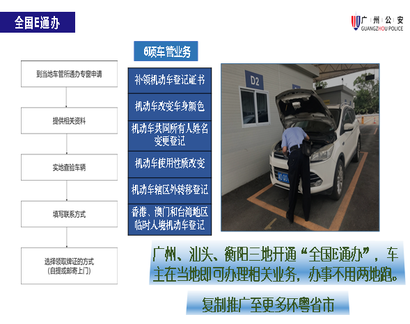 目前,广州市公安局已联合湖南省衡阳市、广东省汕头市、广西壮族自治区防城港市交警部门建立“跨域通办”机制,提供“机动车改变车身颜色”“机动车共同所有人姓名变更登记”等6项车管“跨域通办”服务。下一步,广州市公安局将在试点成功的基础上,推进与省内外其他城市“跨域通办”合作,逐步推出更多“全国通办”事项。