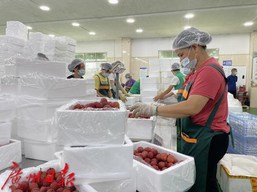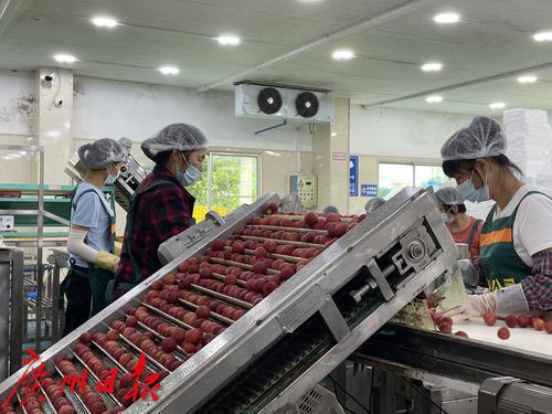 在从化华隆果菜保鲜有限公司的智能荔枝加工生产车间里,记者看到一群工人正在与机器搭配,挑拣荔枝、装冰袋、打包、封箱……这只是荔枝储存的一部分工序。